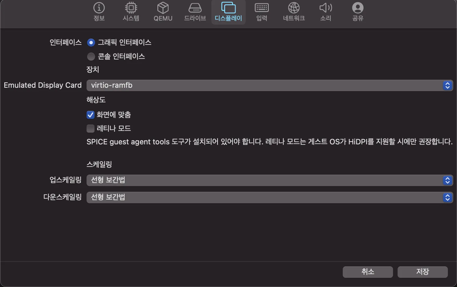 [Display] 탭에는, 그래픽 인터페이스와 콘솔 인터페이스를 선택할 수 있습니다.