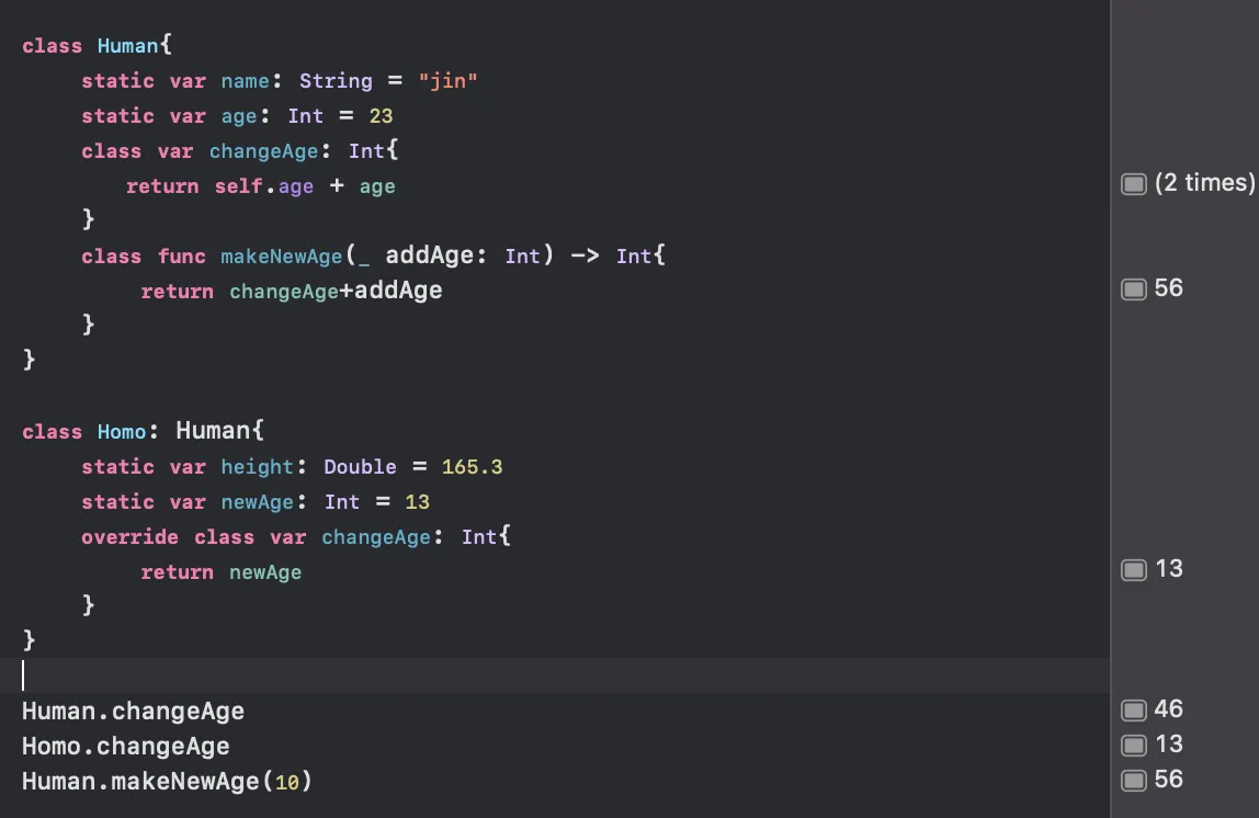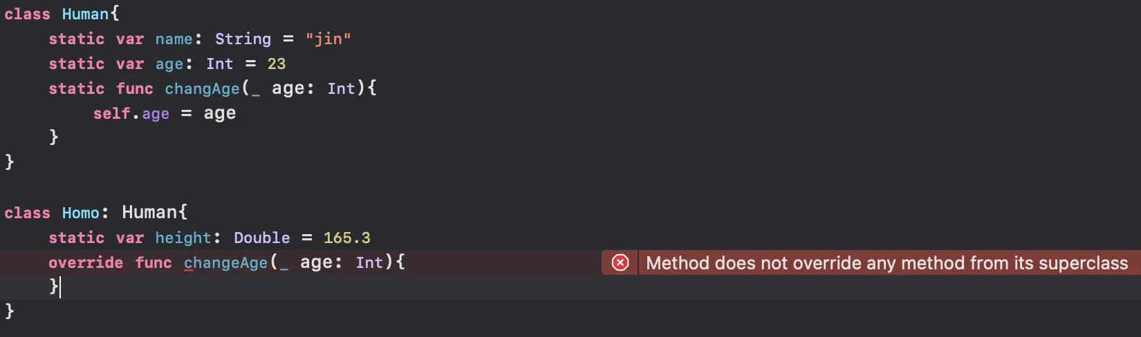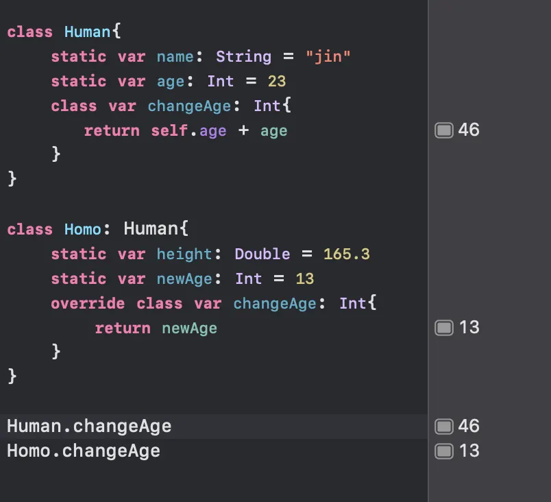 class 키워드의 연산프로퍼티는 오버라이드가 된다.
