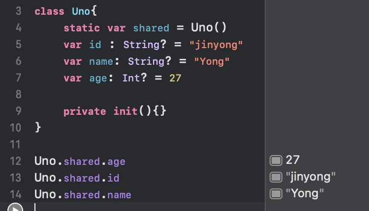 위의 방법처럼 Uno.shared를 통해서 전역적으로 선언된 타입프로퍼티에 접근하게 되면 단 하나의 인스턴스에 접근하게 되는것이다. 이를 통해서 싱글톤 패턴을 만들수 있게 된다.
