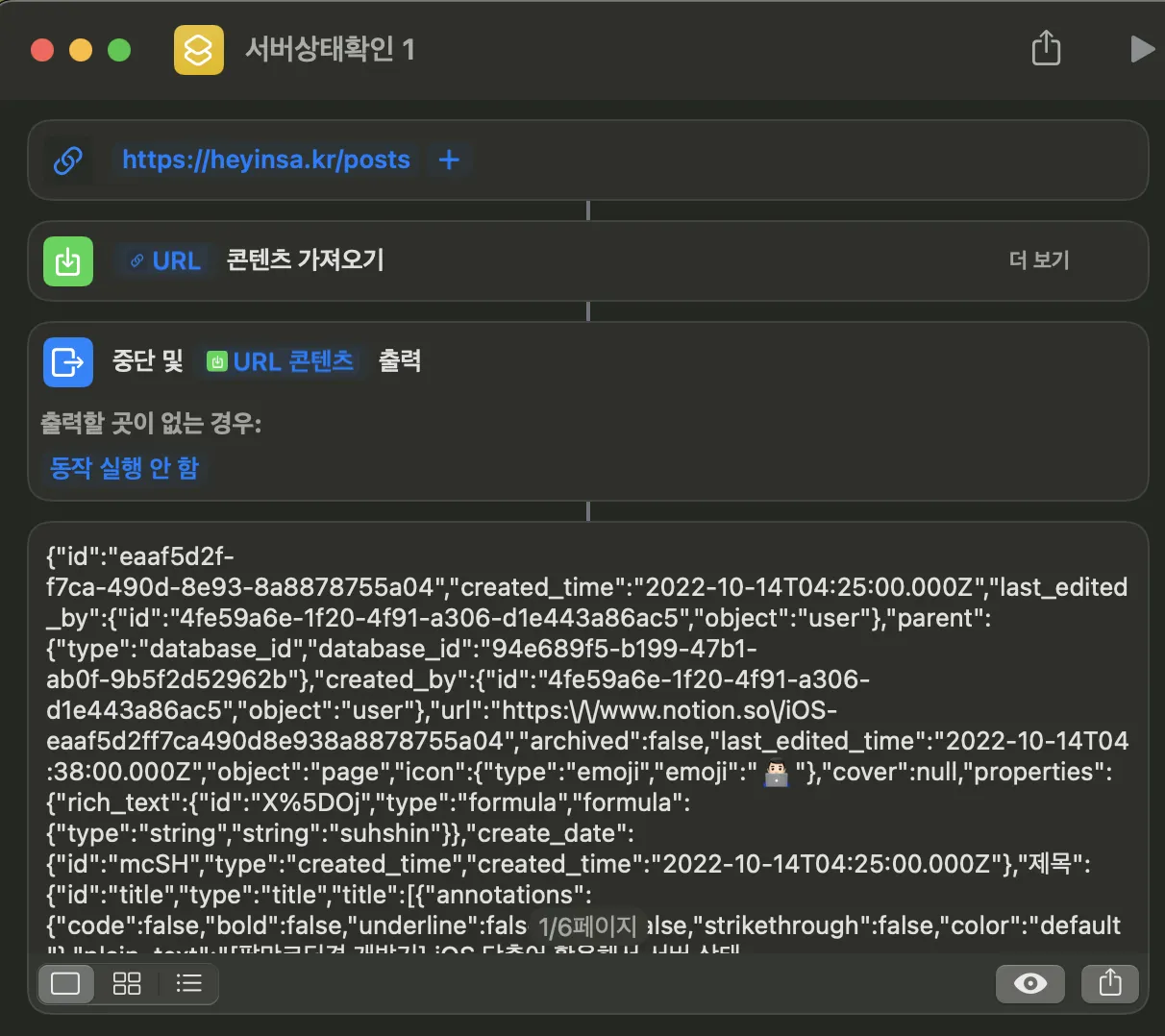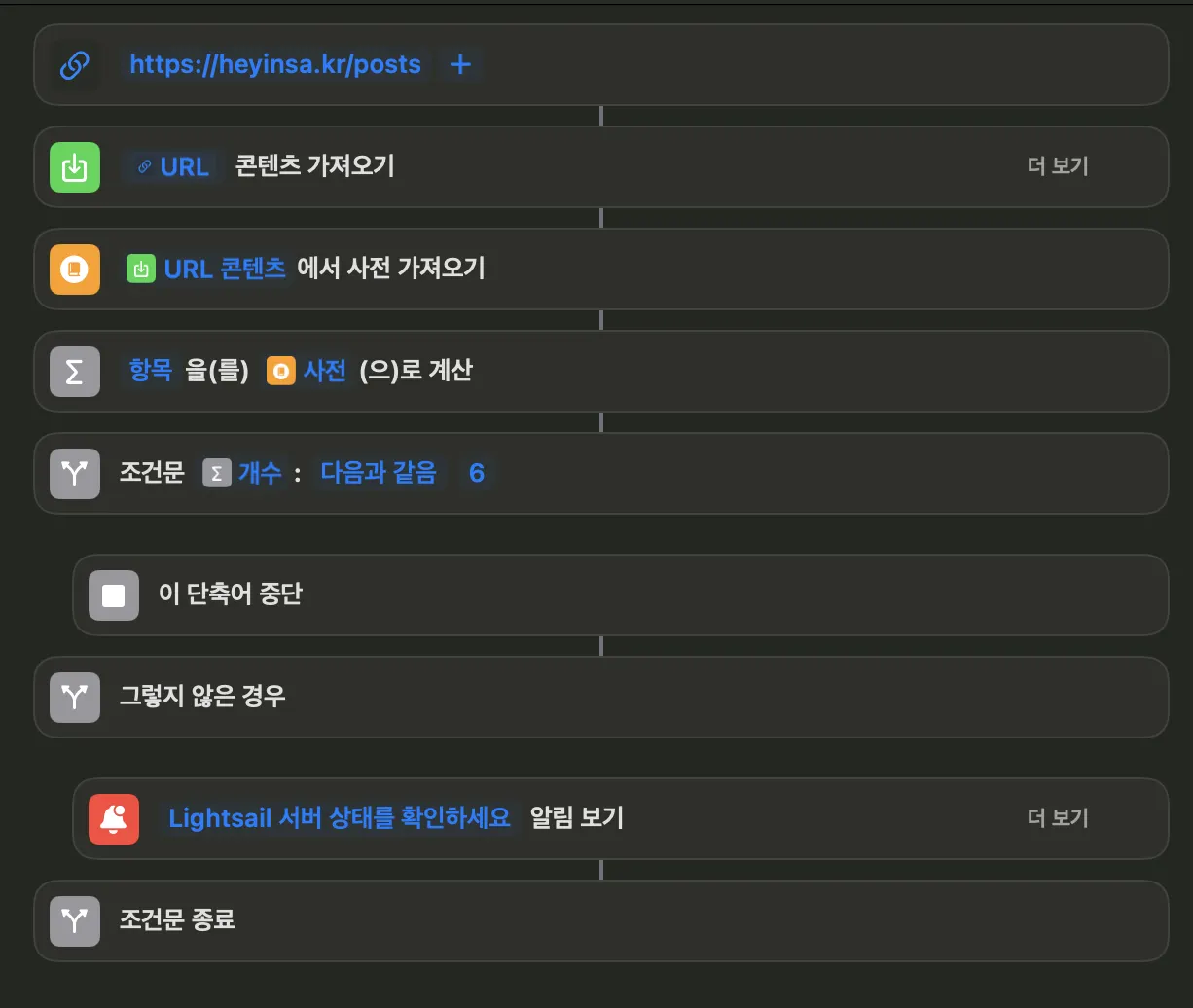 그래서 마지막으로 생각한것이 ios 단축어를 활용한 서버 상태 체크이다. 단축어를 활용하면 휴대폰 푸시 알림으로 실패했을 때 나에게 빠르게 알려줄 수 있을 것 같았다.