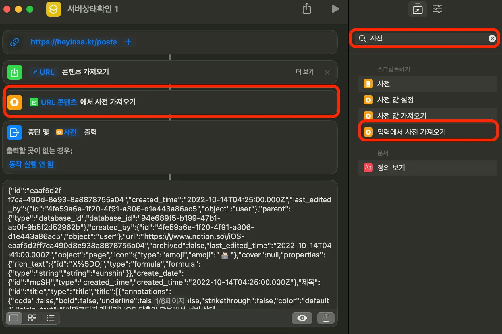 그런데 텍스트로만 나오니까 이 결과를 활용하기가 어려웠다. 그러다 출력 아래 부분의 버튼을 눌러 보았더니 URL 콘텐츠를 사전 타입으로 가져오고 있는 것을 확인할 수 있었다!!