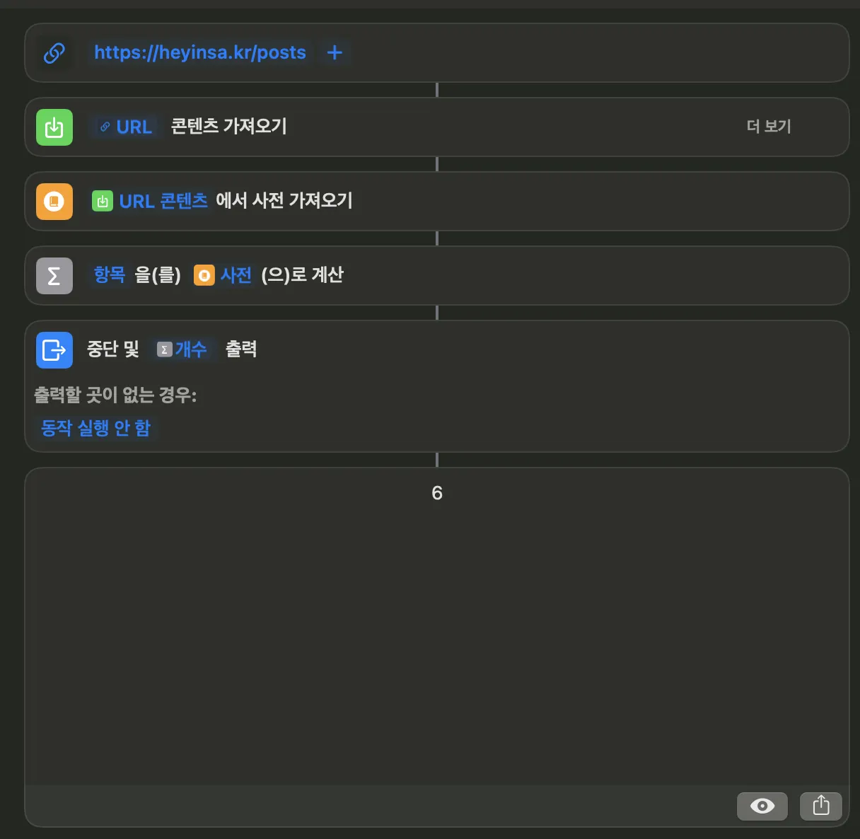 마침 개수 세기명령도 있어서 바로 넣어봤더니 결과가 잘 나왔다!! 단축어 스크립트가 생각보다 엄청 잘 되어있다고 느끼는 순간이였다.