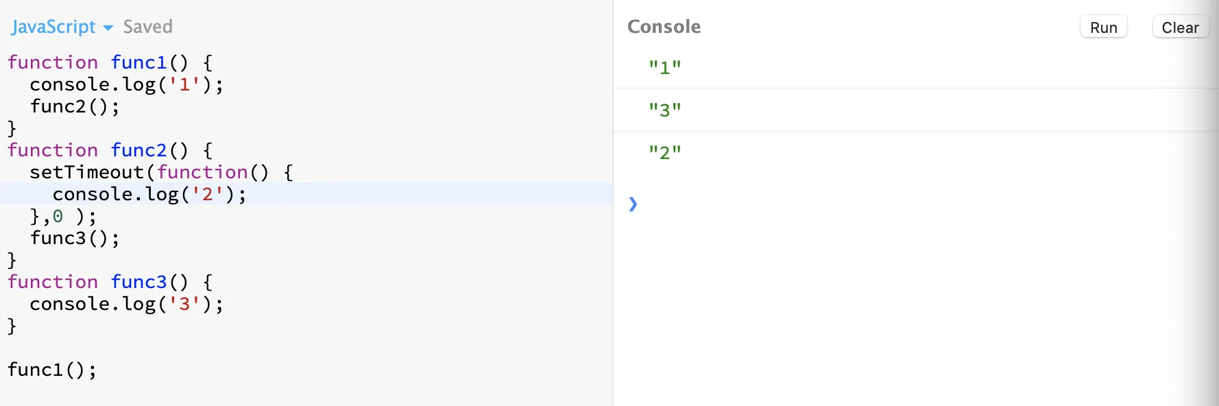 func1 함수는 1000ms, func2함수는 500ms, func3함수는 1500ms의 대기 시간을 설정해두고 실행해 보았다. 일단 출력으로 보이는 내용은 역시나 대기가 끝나는 순서대로 숫자를 출력해주게 된다. 내부적으로는 어떤식으로 작동할까.