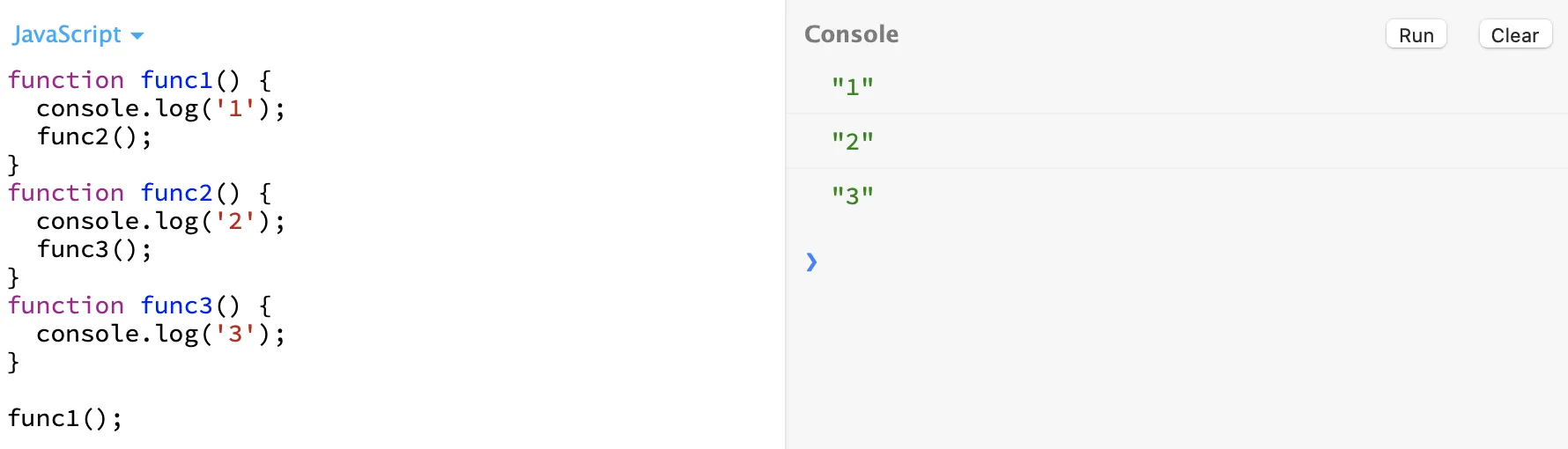func1이 실행되는동안은 다른 작업들을 수행하지 못하도록 block해둔다. 그래서 func2와 func3은 func1이 끝날때까지 대기를 하게 된다. 이제 Console에 1을 출력하는 func1이 끝나고 나면 다음 업무에 대한 입력을 받게된다. 이렇게 func2, func3에 대한 처리를 끝낸 후 위의 코드가 끝나게 된다.