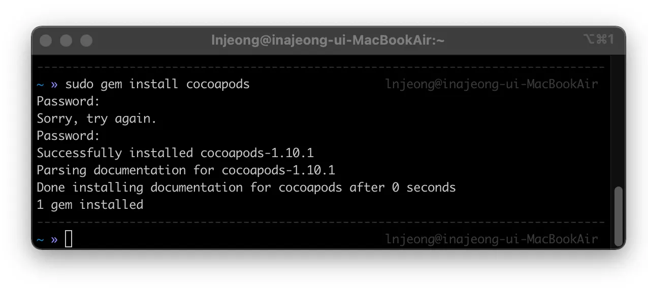 아래 코드를 사용하여 cocoapods 를 설치해준다.