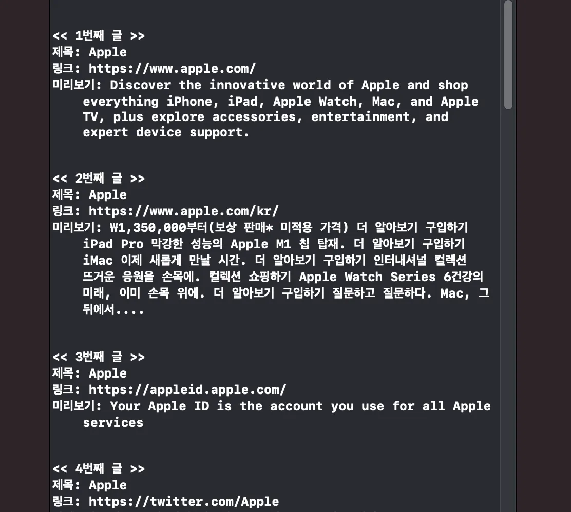 이제 apple 을 검색했을 때나오는 여러 글들을 모두 가져와 출력해보자.