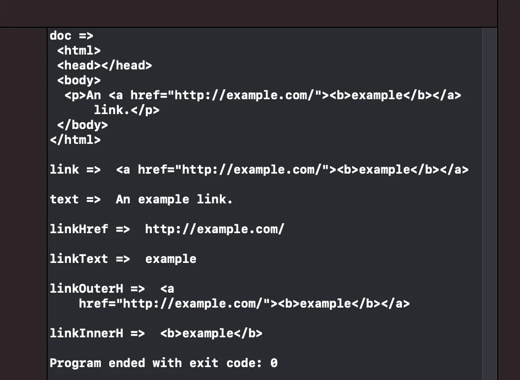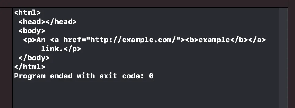 let html: String = "<p>An <a href='http://example.com/'><b>example</b></a> link.</p>";