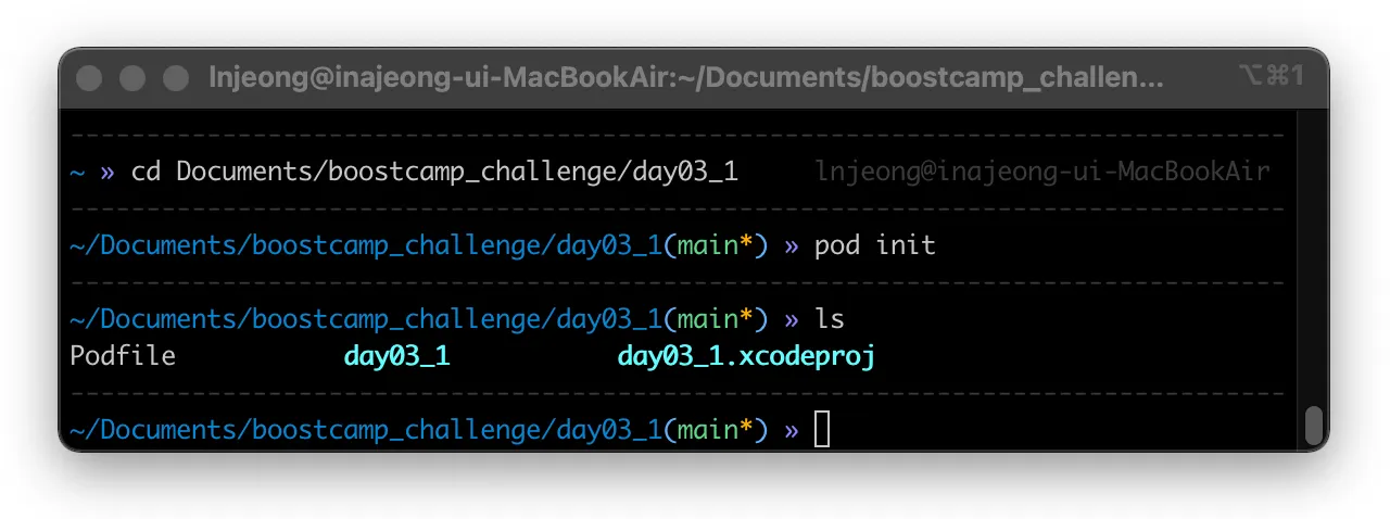 코코아팟 라이브러리를 적용하고 싶은 프로젝트 경로에 들어가서 아래의 명령어를 입력하여 podfile 을 생성해준다. 이제 podfile 을 수정하여 라이브러리를 다운 받을 수 있다. 여기서 podfile 이란 cocoapods 가 관리할 라이브러리들을 설정하기 위한 파일이다.
