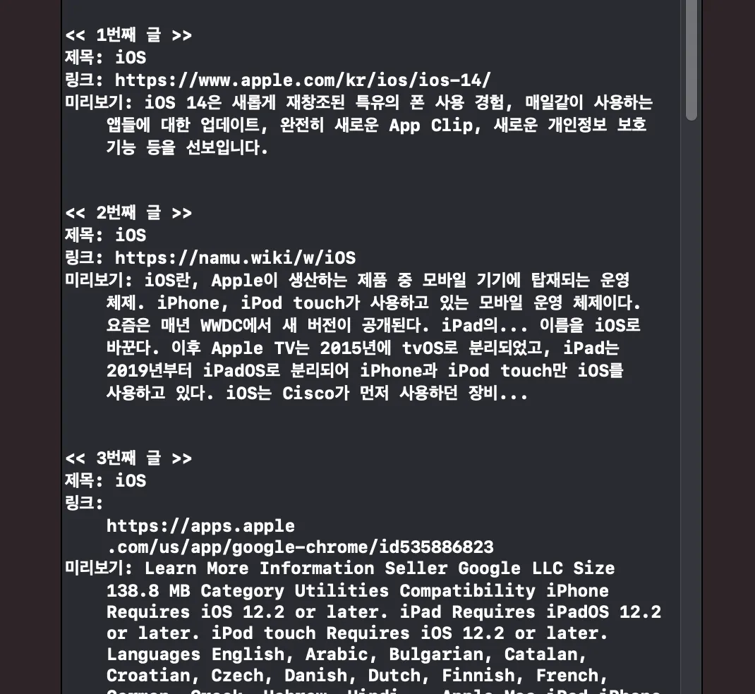 이제 apple 을 검색했을 때 처음으로 나오는 글의 제목/링크/내용을 가져온 것이다.
