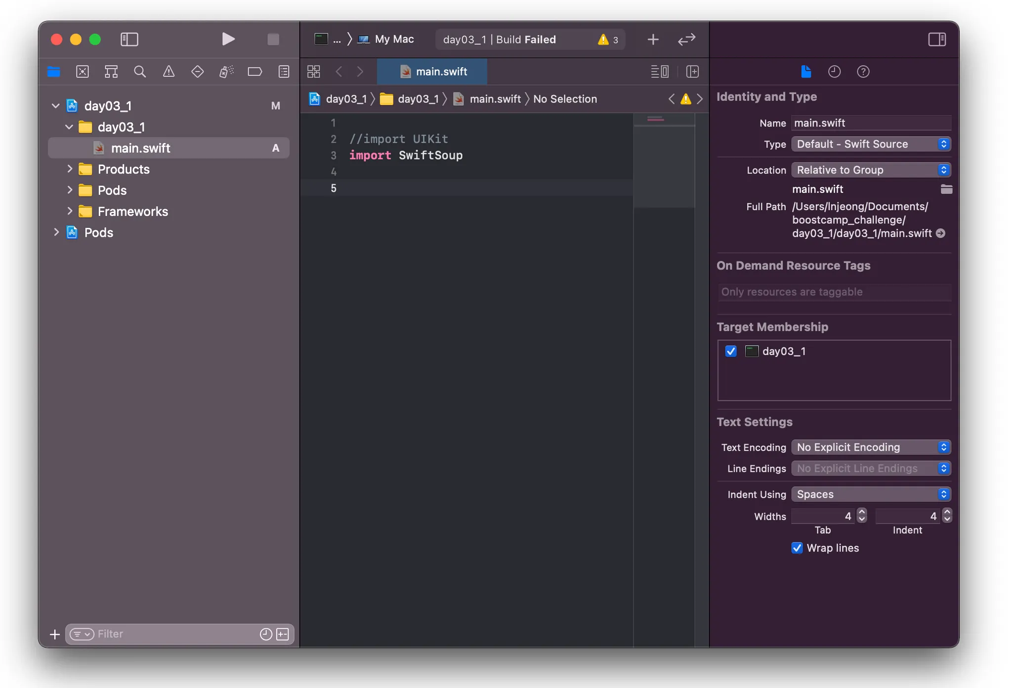 .xcworkspace 파일을 열어 import SwiftSoup를 넣어보니 에러가 안뜨는 것으로 보아하니 SwiftSoup 라이브러리 설치가 잘 된것같다!