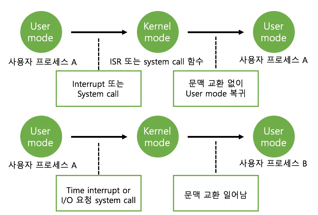 사용자 프로세스 A → I/O(입출력) 요청 System Call 또는 time interrupt → 커널모드 → 사용자 프로세스 B