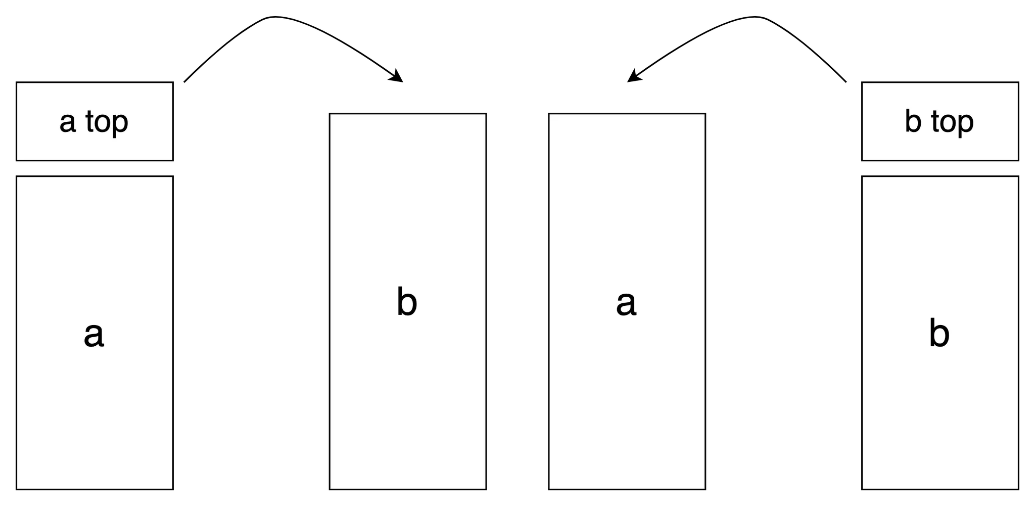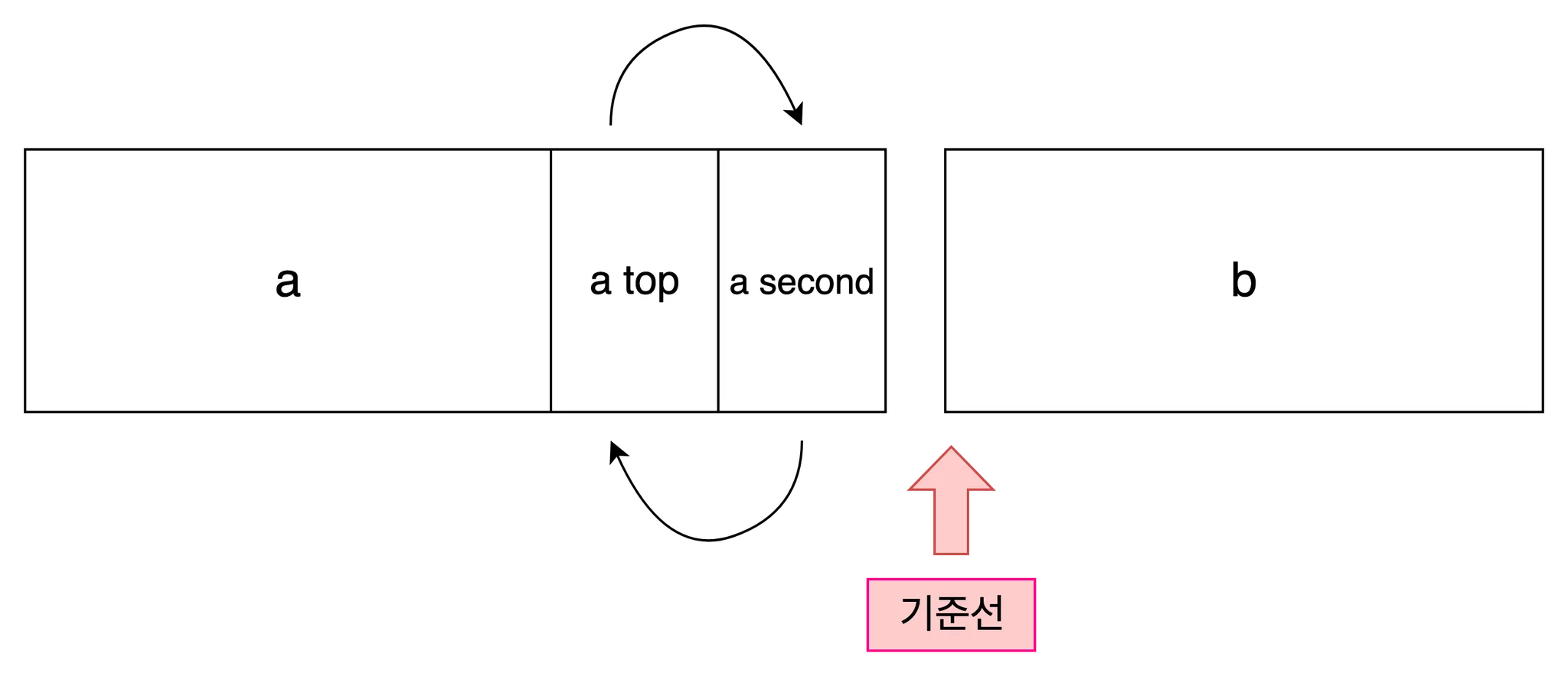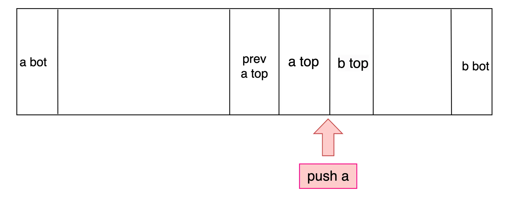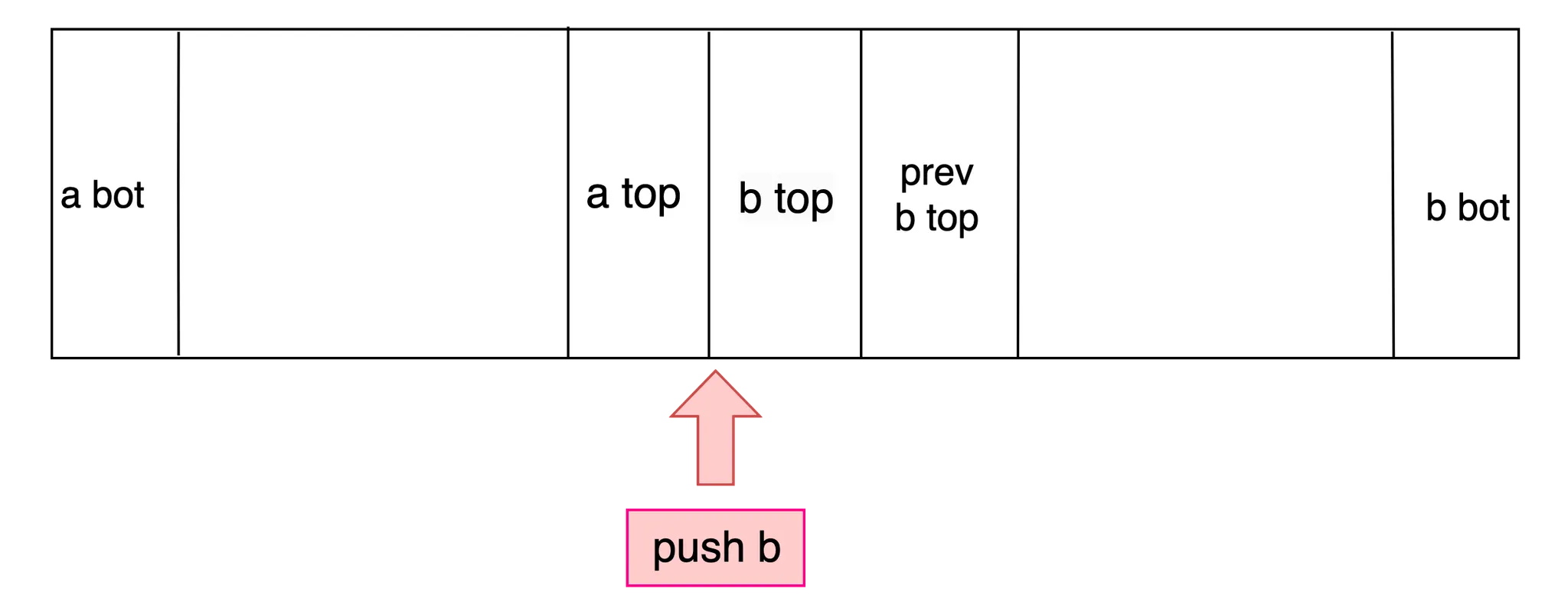 두 스택 a, b에 대하여 서로의 top을 이어붙여서 하나의 메모리 덩어리로 만든다. 그 결과는 다음과 같다.
