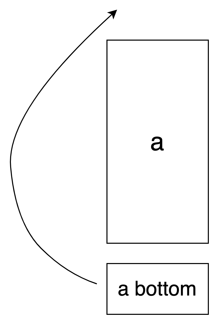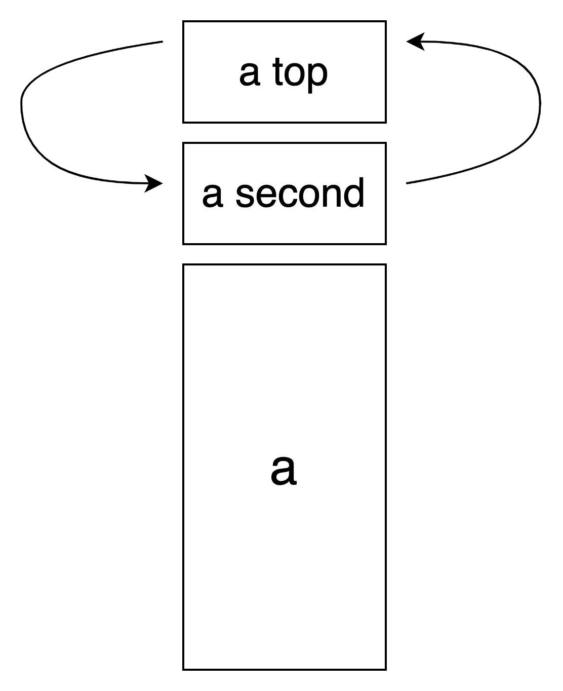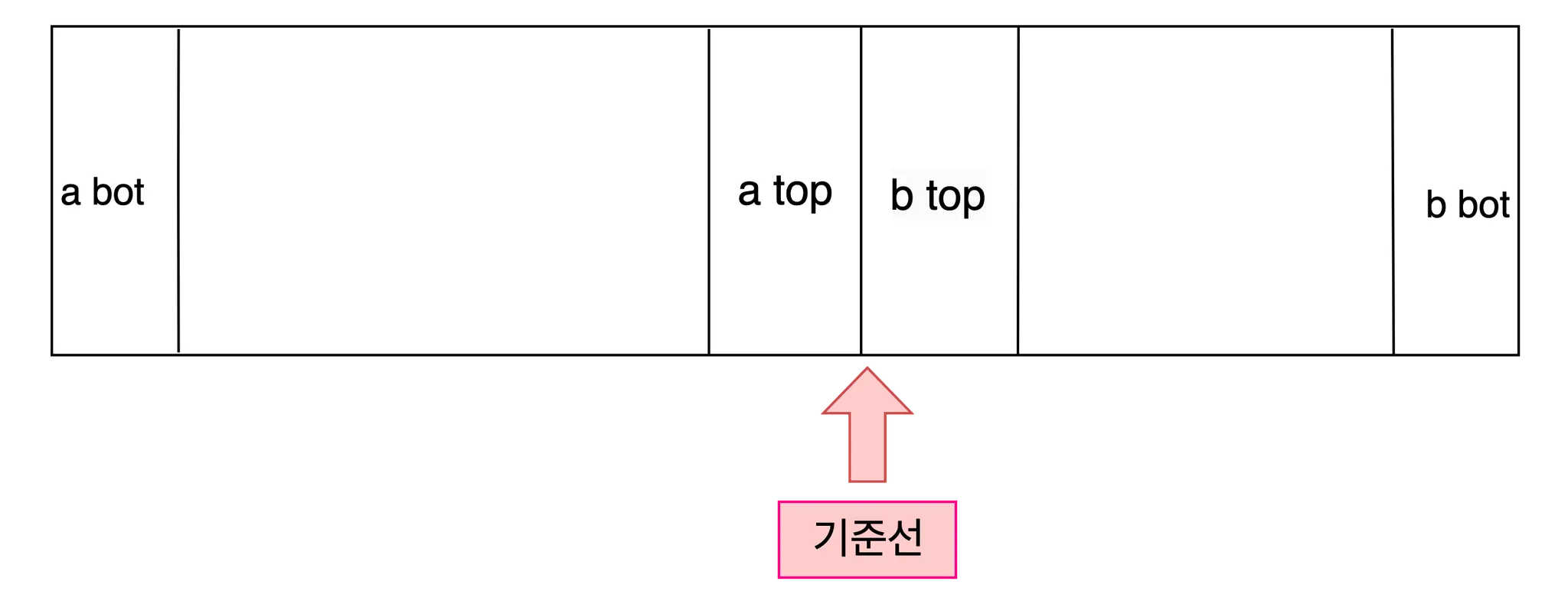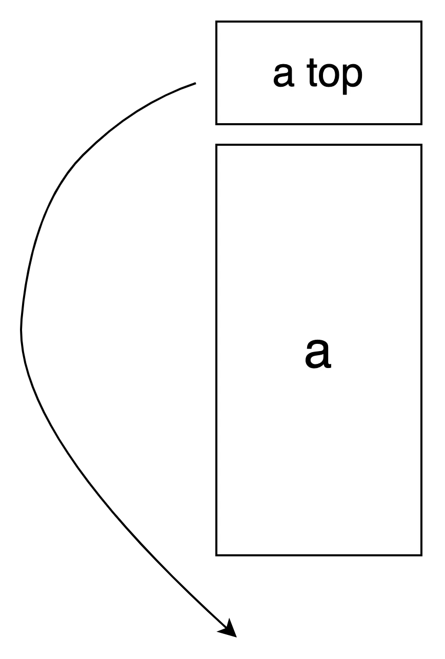 두 스택 a, b에 대하여 서로의 top을 이어붙여서 하나의 메모리 덩어리로 만든다. 그 결과는 다음과 같다.