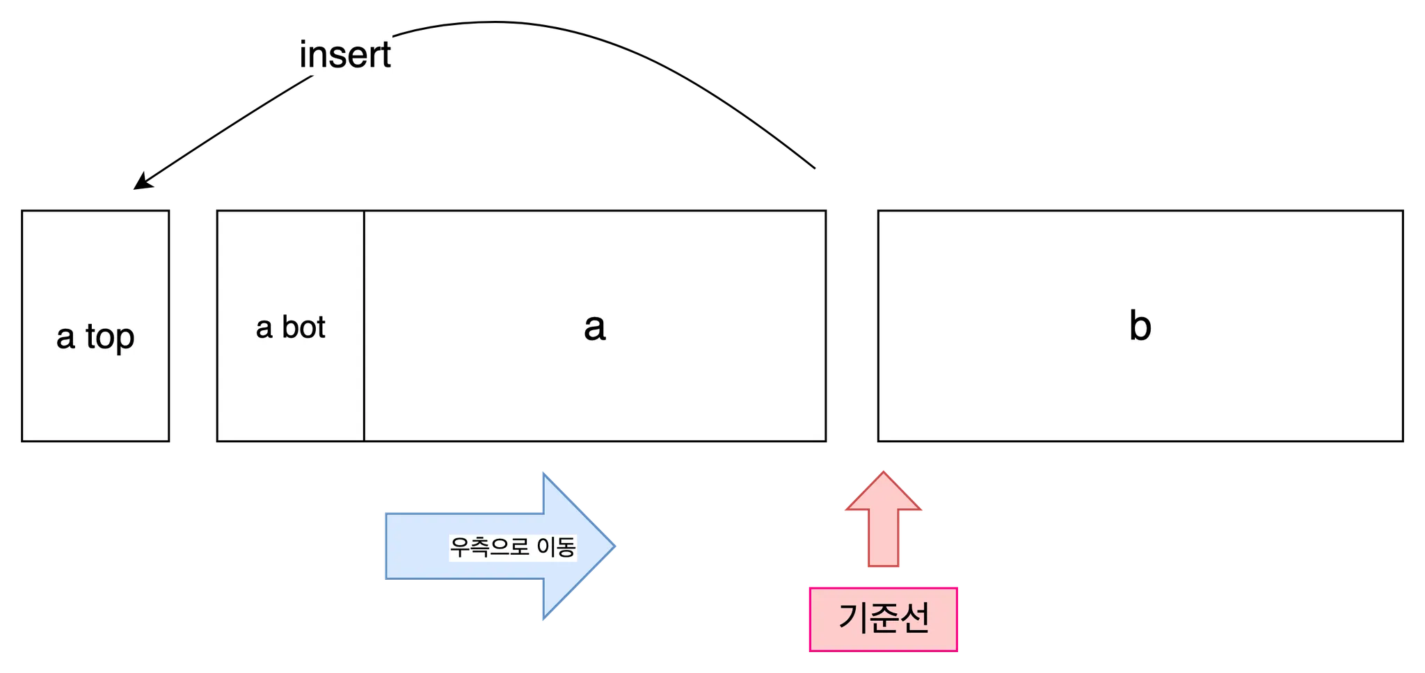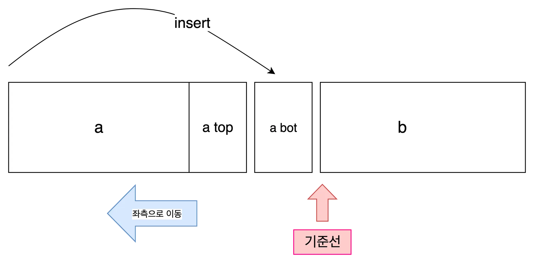 끝단의 한 원소가 기준선 좌,우에 삽입된다. 마찬가지 원리로 나머지 원소들은 한 칸 이동한다.