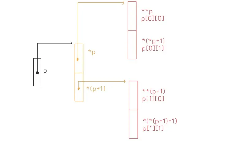 포인터 p는 노란색 메모리의 시작 주소를, 노란색 메모리는 각 빨간색 메모리의 시작 주소를 가르킨다.