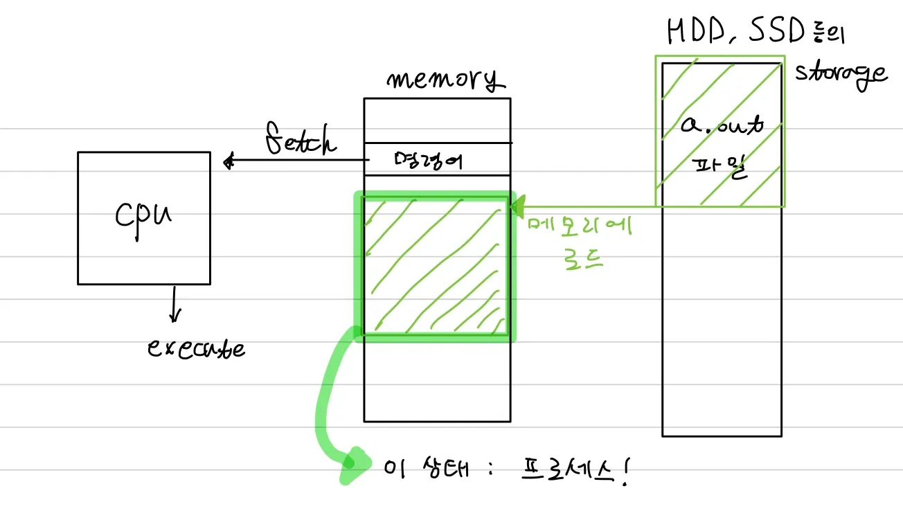 우리가 ./a.out 등의 명령어를 통해 HDD, SSD등의 하드웨어 storage에 저장되어있는 a.out 파일을 실행 하거나 GUI 환경에서 더블 클릭등을 하면, 해당 프로그램을 실행하기 위해 우선 메모리에 a.out을 로드하게 되는데, cpu가 fetch할 수 있게 메모리에 로드 된 이 상태에 있는 프로그램을 “프로세스” 라고 한다.