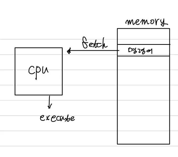 지난 챕터에서 공부했던, 폰노이만 아키텍처 구조의 컴퓨터는 위의 그림처럼 메모리에 로딩된 명령어를 cpu가 fetch해서 execute하는 구조이다.