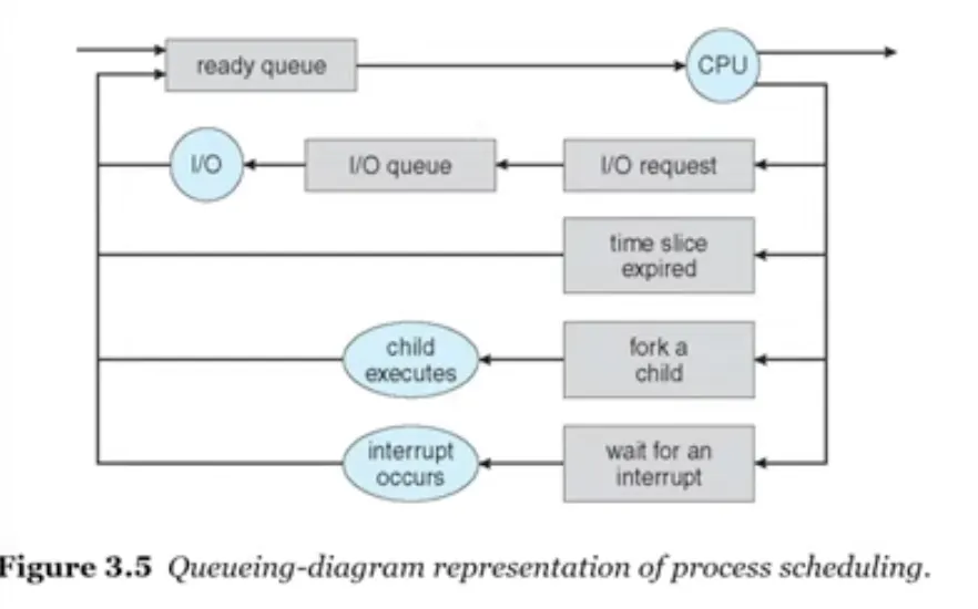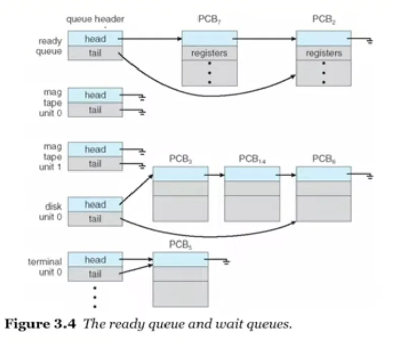 스케줄링 큐(FIFO) : ready 큐에 있다가 running상태가 되는데(cpu를 점유), 때에따라 waiting 큐로 가기도 함.