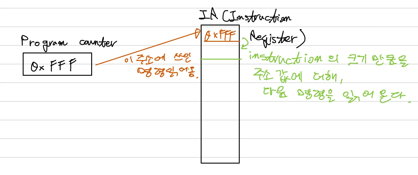 다음에 실행된 명령어를 가지고 있다. ⇒ 명령어 포인터 라고도 한다.⇒ 인텔 계열에서는 IP(Instruction Pointer)라고도 한다.
