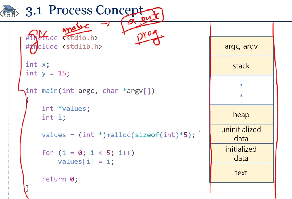 왼쪽의 소스코드를 컴파일 하면 프로그램이 되고, 이 프로그램이 이렇게 메모리에 로드되면 프로세스(실행중인 프로그램)가 됨. ⇒ OS는 “프로세스”를 관리한다!