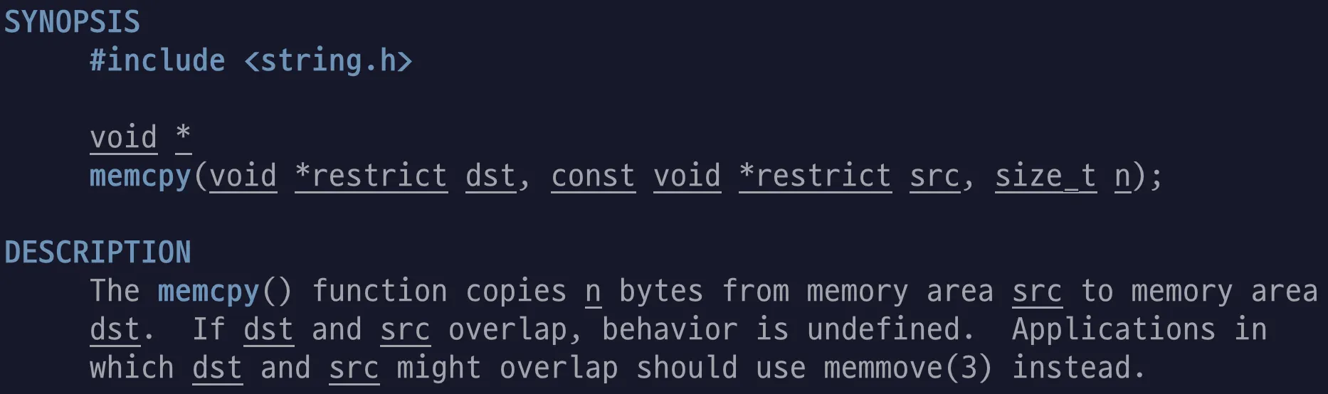 그런데 memcpy의 man 페이지를 살펴보면, 복사 받는 영역과 복사할 영역이 겹치면 동작이 정의되지 않는다! 겹칠 가능성이 있는 경우, memmove를 사용해라! 라는 설명이 있다.