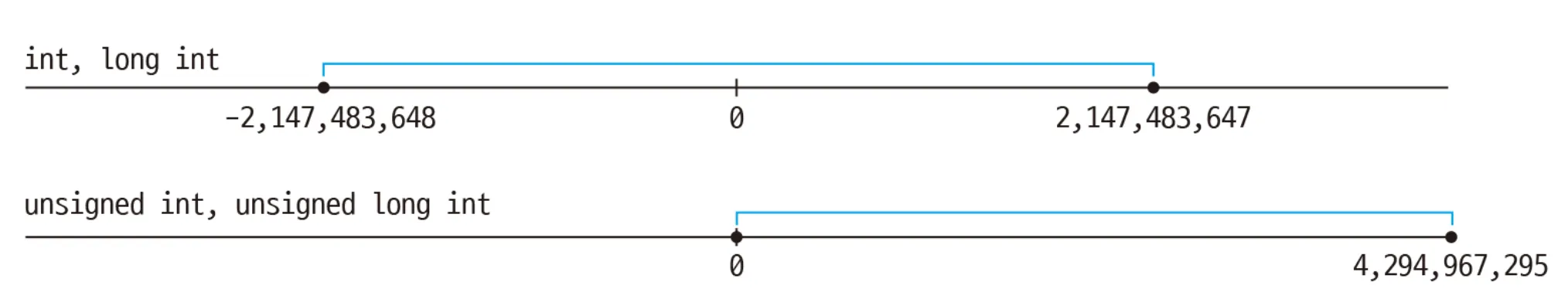 하지만 대응하는 signed 타입과 비교했을 때 자료형의 크기는 변하지 않기 때문에