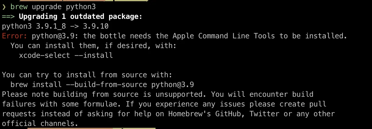 에러가 났다면 다시 brew upgrade python 명령을 통해서 업그레이드를 진행하자! 업그레이드가 완료된 후 버전확인을 진행해보면 원하는 버전이 설치된 것을 확인할 수 있다.