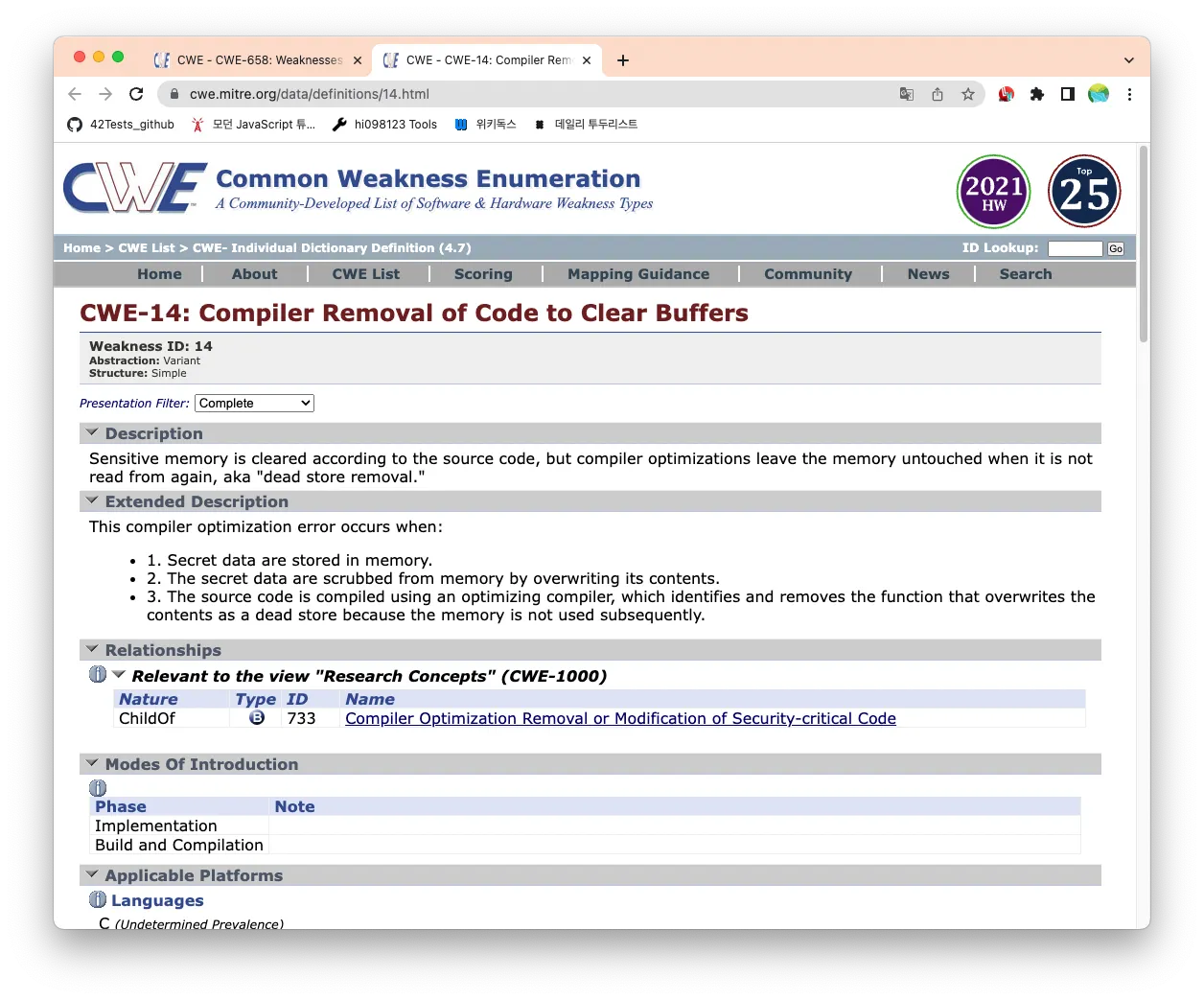 CWE-14는 컴파일러 최적화(optimization) 시 발생하는 deat store를 주의해야한다는 내용이다.