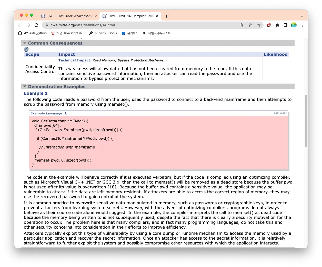 CWE-14의 페이지에는 이러한 데드 스토어가 발생할 수 있는 예시(example)와 어떻게 악용할 수 있는지에 대하여 상세하게 설명한다.