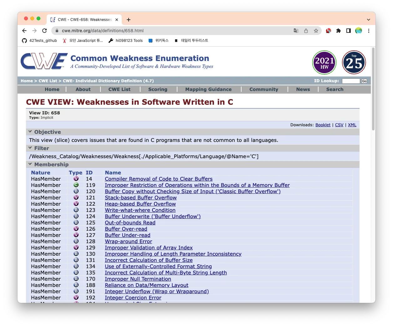 예를 들어, Weaknesses in Software Written in C에는 과제를 하면서 자주 언급됐던 다음과 같은 약점(weakness)들이 있습니다.