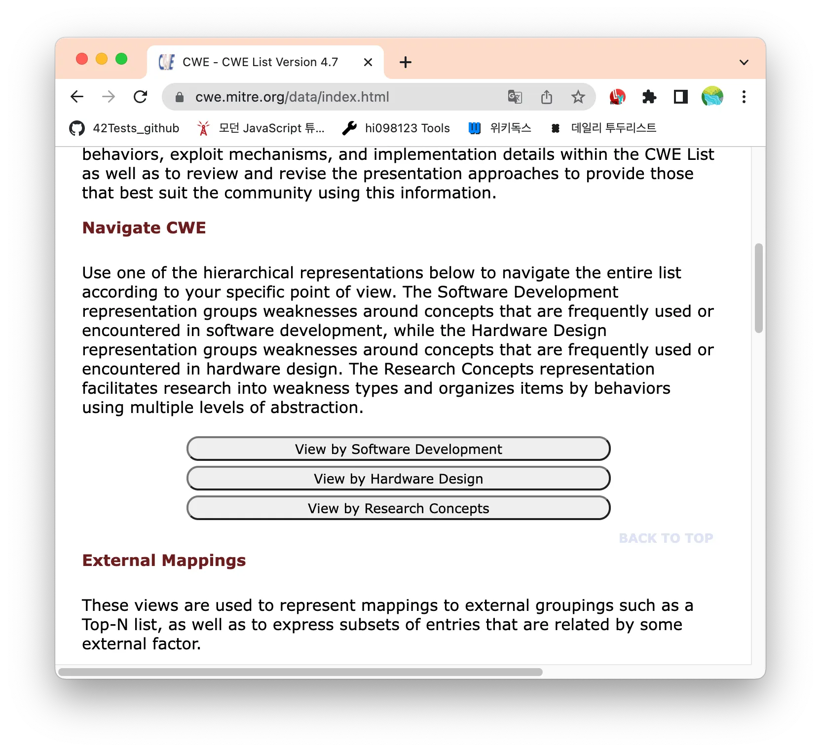 시큐어코딩의 중요성을 이해하고, 지향하고 있다면 CWE를 가볍게 한번 훑어보는 것도 좋을 것 같습니다.
