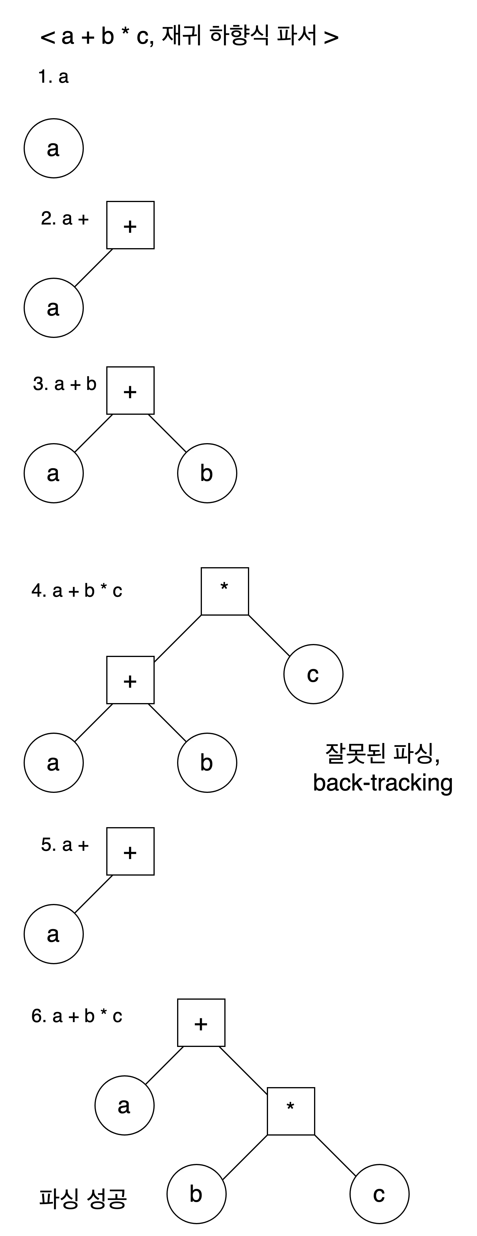 해당 알고리즘은 가능한 모든 문법 패턴에 대해서 해석을 시도한다는 점에서 완전 탐색 알고리즘이다. 재귀 하향식 파서는 해당 구문에 문법적 오류가 있어 해석이 불가능한 상황을 만나면, 다음 문법으로 해석을 시도해야 하고 이는 필연적으로 back-tracking을 의미한다. 이러한 back-tracking 과정에는 기존의 해석(즉 생성한 ast)을 모두 취소(즉 ast를 삭제)하는 과정을 포함한다. 이러한 백트래킹은 다음과 같은 문제를 갖는다.