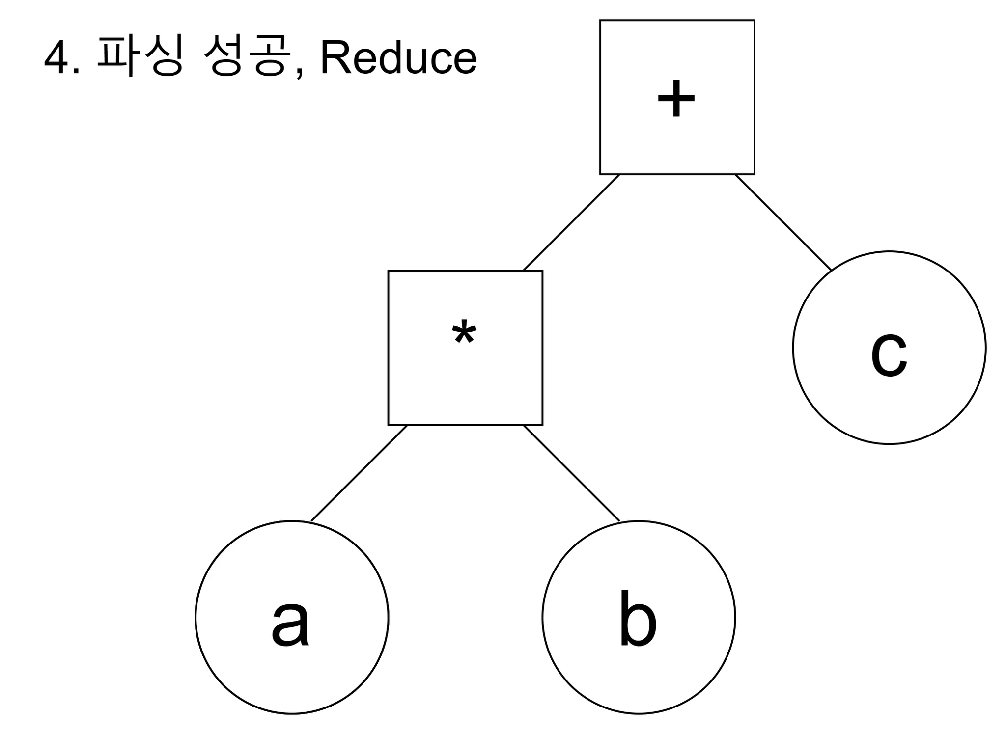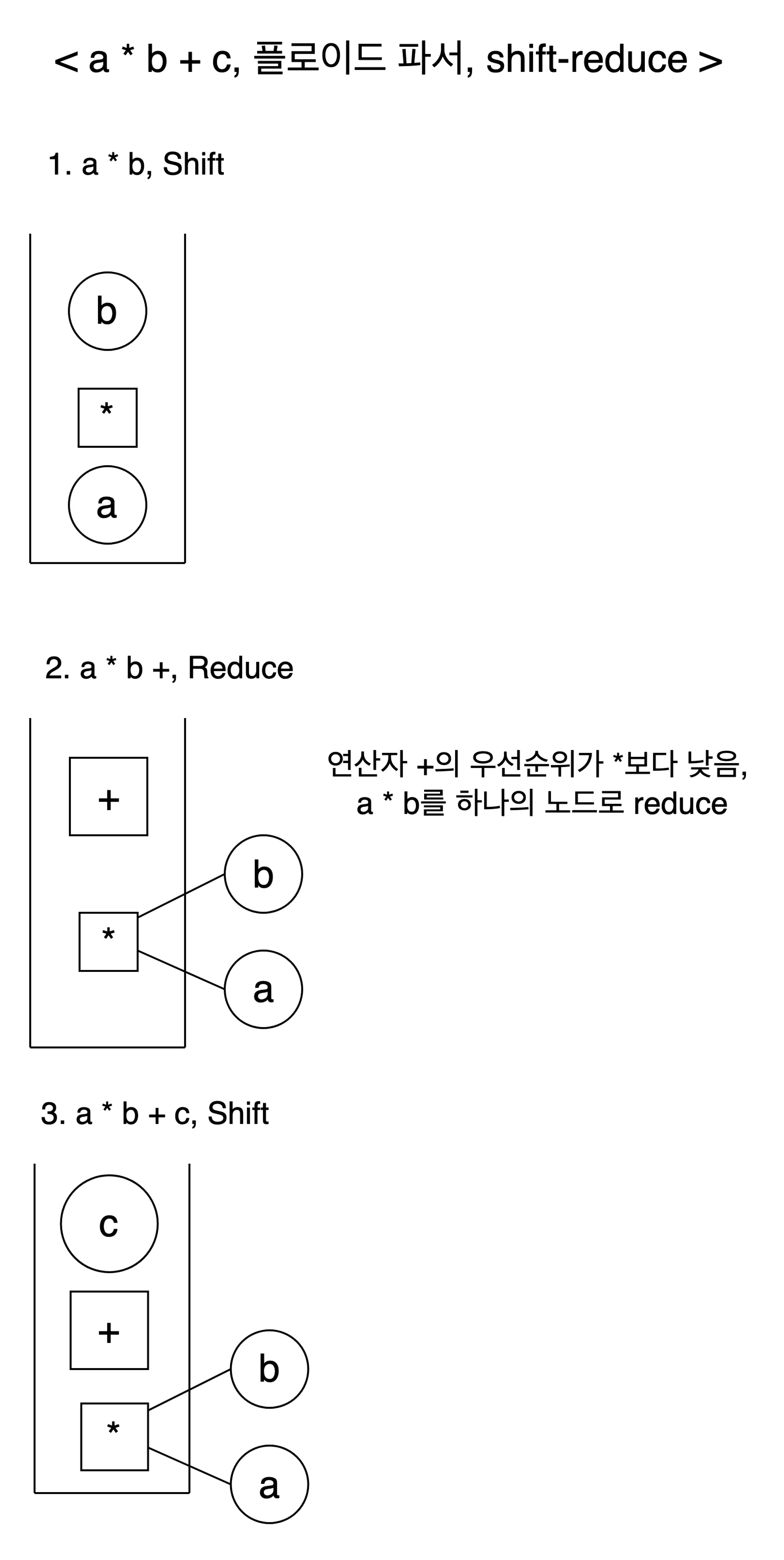 위는 대표적인 상향식 파서인 shift-reduce 파서에 연산자 우선순위를 결합한 결과이다. 해당 파서는 token들을 순서대로 확인하며, 토큰을 stack에 저장하며 파싱을 수행한다. shift는 통과(stack에 push), reduce는 결합(stack의 노드를 결합하여 축소)을 의미하는데, 현재 연산자보다 이전 연산자의 우선순위가 높다면 stack의 내용물을 결합(reduce)한 후 shift(stack에 token을 push)한다.