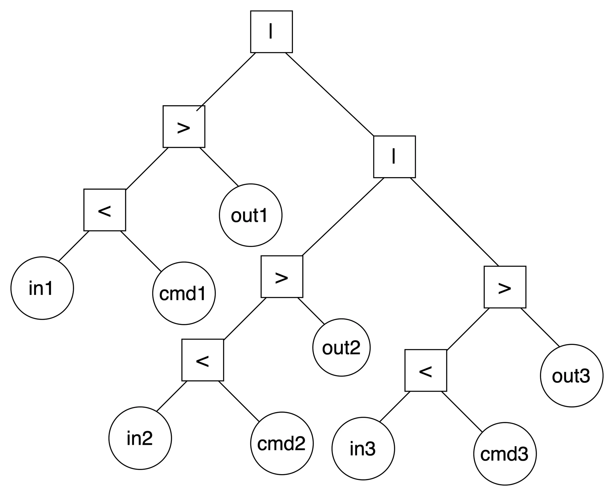 <in1 command1 >out1 | <in1 command2 >out2 | <in3 command3 >out3