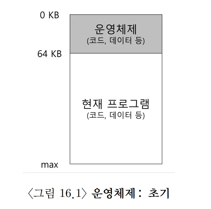 초기의 컴퓨터는 한번에 하나의 프로세스만 실행 할 수 있었기 때문에 아주 간단한 주소 공간을 가지고 있었다. 물리 메모리에 운영체제가 항상 상주하고 있었고 나머지공간은 프로세스를 위한 공간이었다.