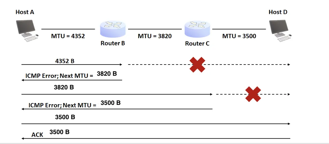 → IP Datagram 플레그 중에 DF(Don't Fragment)라는 것이 있는데, 해당 값이 1이면 패킷을 자르지 못한다는 의미이다. DF값을 1로 놓은 상태로 Router B에게 보내면, Router B는 DF 플레그가 1이기 때문에 Datagram을 자르지 않게 된다. 여기서 자르는 경우는 어떤 경우냐면, 다음 링크의 MTU가 Datagram의 크기보다 작을 경우에 자르게 됩니다. 다시 돌아와서, DF플레그가 1로 설정이 되었는데, Router B에서 Datagram이 이동할 링크의 MTU보다 크므로 ICMP Message를 생성해서 Host A로 다시 보냅니다. 그렇게 Host A는 Datagram의 사이즈를 조정하여 다시 보내게 되고, 이런식으로 반복하여 Destination까지의 MTU를 구할 수 있게 됩니다.