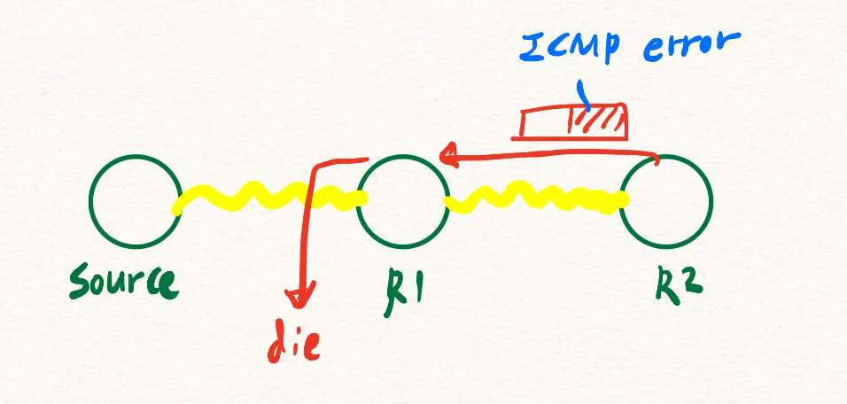 위 그림에서 보면, 라우터 R2에서 생성한 ICMP Error 메세지가 만약에 R1에서 죽었다고 한다면, 죽은 것에 대한 ICMP Message를 생성하지 않는다. (이유는, 에러의 에러의 에러 메세지를 만드는 것을 생각해 보면 된다. 복잡하지 않은가?)