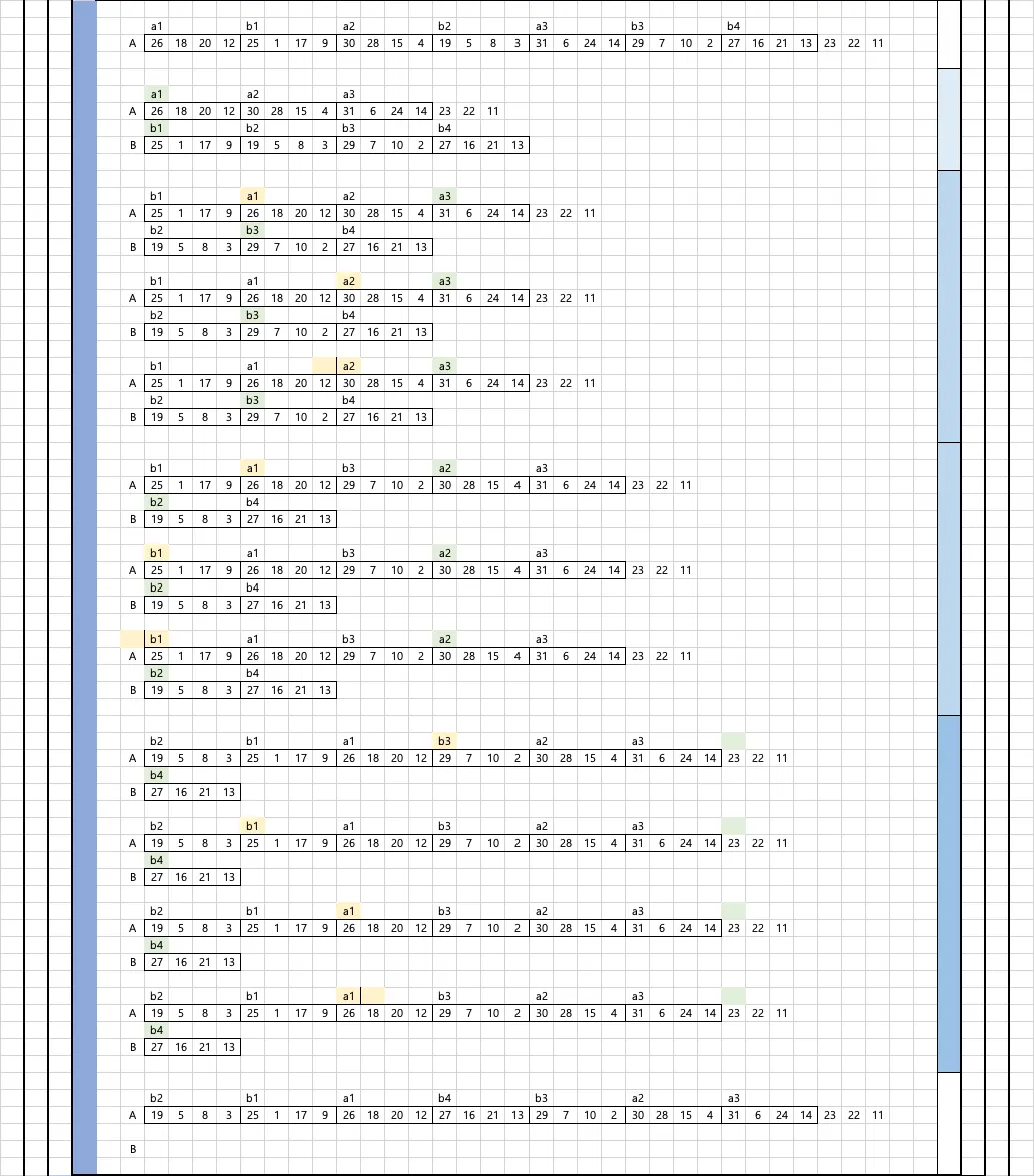 이진탐색의 횟수가 1일 땐 이미 쌍을 만들고 큰 값을 a로 삼는 규칙에 따라 b1 < a1이므로 비교 없이 b1을 a1 앞에 삽입합니다.