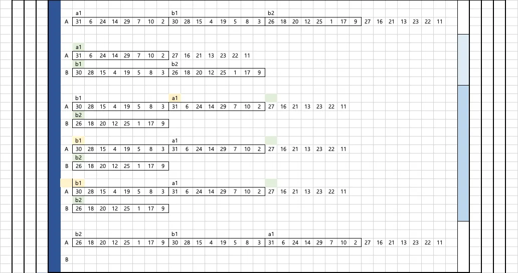 먼저 앞에서부터 두 원소를 한 쌍으로 여기고 큰 값을 a, 작은 값을 b로 간주해야하고 a가 정렬되어있을 때 까지 재귀적으로 반복하면서 정렬한다는 부분에 대해 기존의 a1, a2가 a1, b1으로 쌍으로서 선택되고 그 때 더 큰 값이 a 더 작은 값이 b가 되어야 한다고 봤습니다.