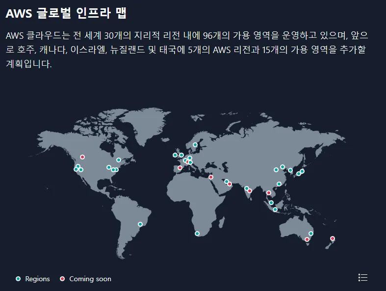 현재 AWS는 30개 지역에서 인프라를 유지하고 있으며 5개 지역을 추가로 확장하고 있다. 245개 국가에서 가용할 수 있으며 400개 이상의 엣지 로케이션과 13개의 리전별 엣지 캐시를 가지고 있다.