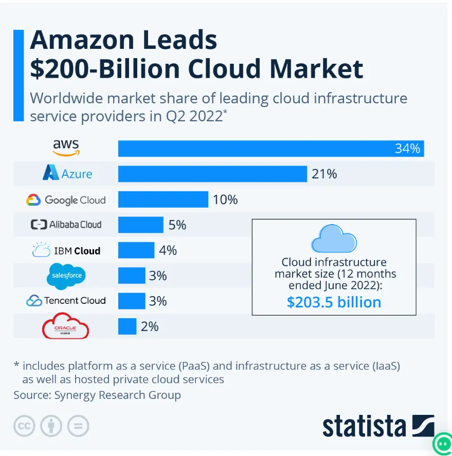 현재 AWS가 34%로 가장 많은 마켓 점유율을 가지고 있으며, Azure가 21%, GCP가 10%, IBM Cloud가 4%로 그 뒤를 이어가고 있다. AWS는 높은 점유율을 바탕으로 지속적인 투자를 이어나가고 있다. 국내에서는 AWS가 50%정도의 점유율을 가지고 있으며, Naver, KT, NHN 등 국내 기업들이 2 - 4위 자리를 차지하고 있다. 국내 점유율을 보더라도 AWS의 존재감이 큰 것을 확인할 수 있다.