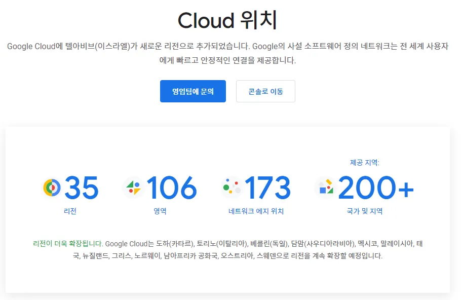 GCP는 35개 리전, 106개 영역, 접근가능 국가 및 지역이 200개 이상으로 AWS와 비슷한 수준의 인프라를 제공하고 있다. 리전 개수는 AWS보다 많으며 현재 확장 중인 리전도 13개 이상으로 scale out에 힘쓰고 있는 모습이다.